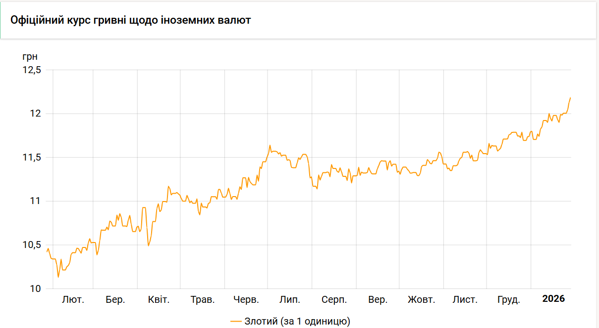 Офіційний курс злотого на 27 січня становив 12,13 гривень, що на 9 копійок більше за попередній день. Протягом 2025 року офіційний курс злотого зріс із 10,15 до 11,80 гривень (+16% або 1,65 гривень).