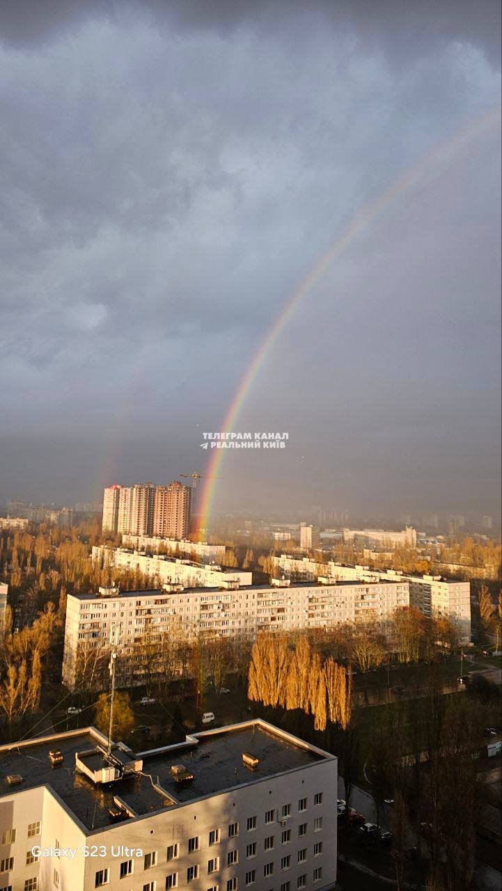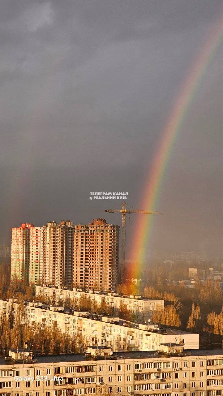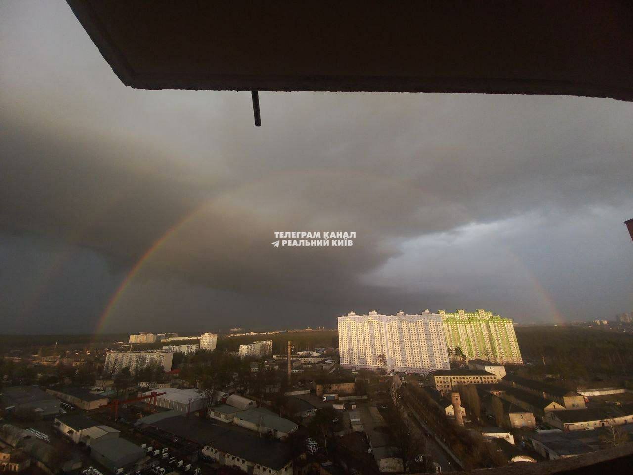 Водночас в інших районах столиці світить яскраве сонце і видно веселку.