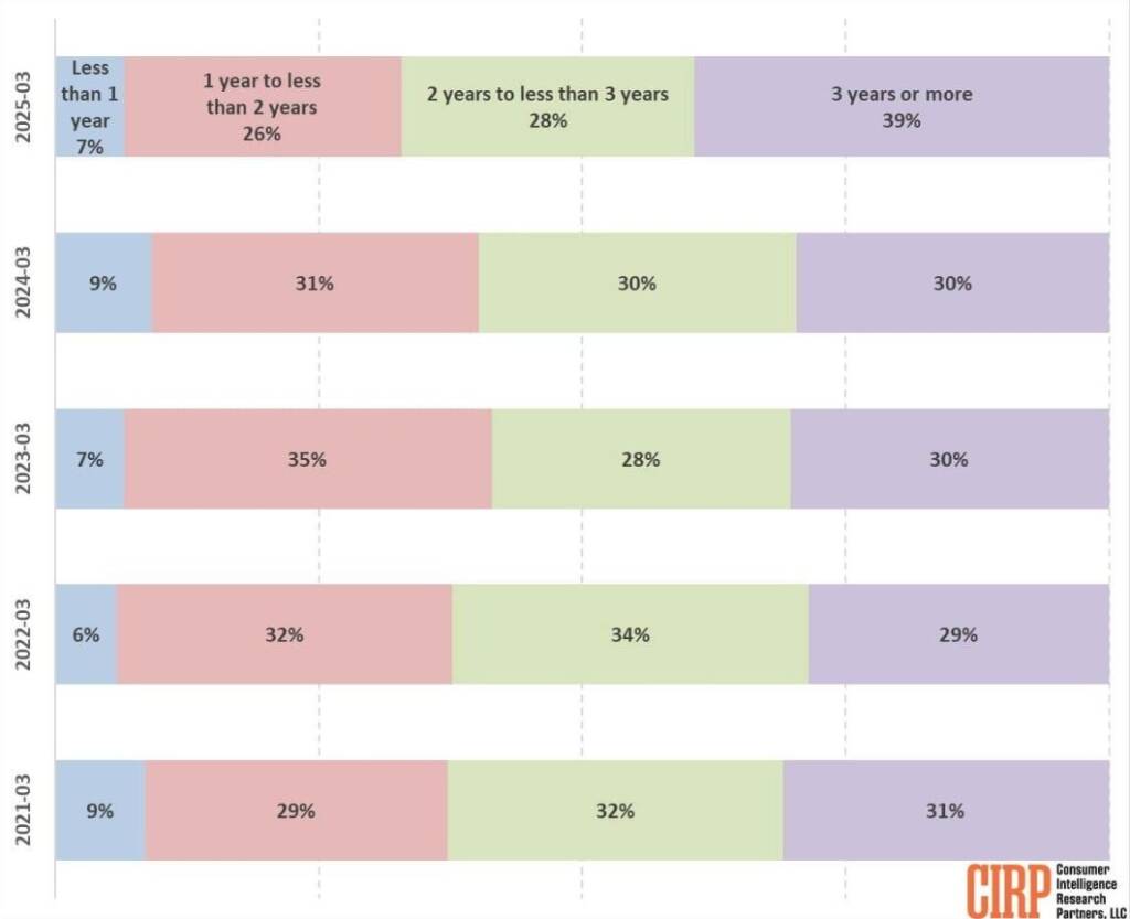 Попри заяви Тіма Кука, що Apple не фіксує підвищеного попиту на iPhone через очікуване зростання цін, аналітики Consumer Intelligence Research Partners (CIRP) виявили зворотне. Згідно з їхніми даними , у першому кварталі 2025 року 39% американських покупців оновили свої iPhone, яким було три роки й більше — у порівнянні з приблизно 30% у попередні роки.