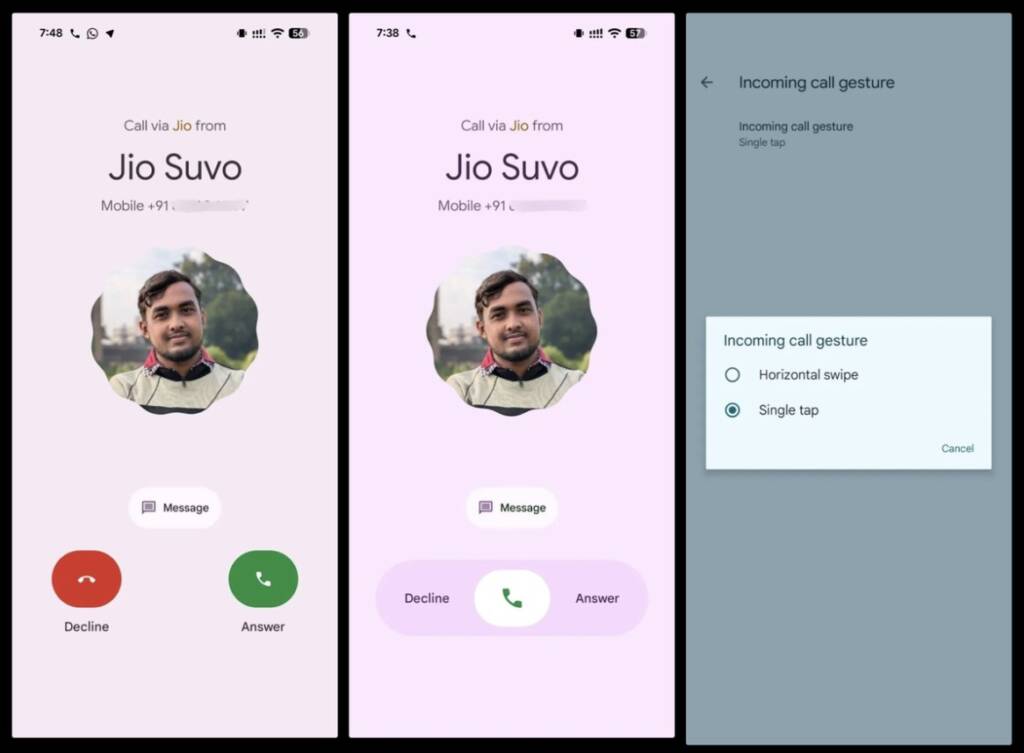 Також додано нове меню налаштувань для екрана вхідного дзвінка. Користувачам пропонують два варіанти взаємодії: у режимі з одним натисканням з’являються великі кнопки «Відповісти» і «Відхилити», якими легко скористатися. Другий варіант — класичний горизонтальний свайп із повзунком-«таблеткою»: щоб відповісти, потрібно провести пальцем вправо, щоб відхилити — вліво.