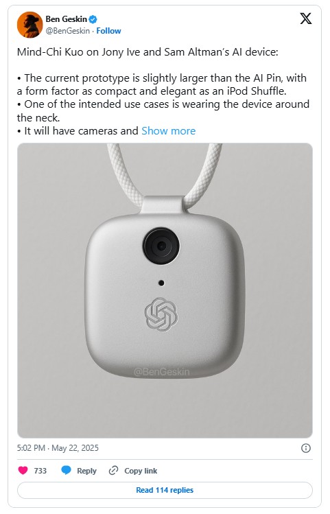 Пристрій буде компактним, без екрана, трохи більшим за Humane AI Pin. Куо порівнює його з iPod Shuffle і зазначає, що один із варіантів використання передбачає носіння на шиї. Гаджет використовуватиме вбудовані камери та мікрофони для взаємодії з навколишнім середовищем, а обчислення виконуватимуться на підключеному смартфоні чи ПК.