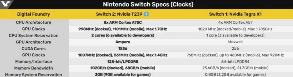 В основі Switch 2 використовується апаратна платформа Nvidia T239, офіційно звана “кастомним чіпом Nvidia”. Центральний процесор містить вісім обчислювальних ядер Cortex-A78C, шість з яких доступні для ігор, а два зарезервовані для системних операцій. На даний момент невідомо, чи зможуть розробники якимось чином змінити розподіл цих ресурсів.