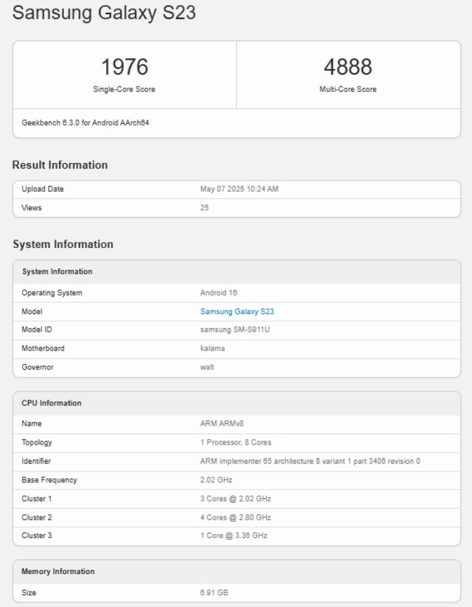 Одразу два смартфони Samsung – Galaxy S23 і S23+ – засвітилися в базі Geekbench з One UI 8 на базі Android 16, незважаючи на те, що One UI 7 тільки нещодавно почала розповсюджуватися.