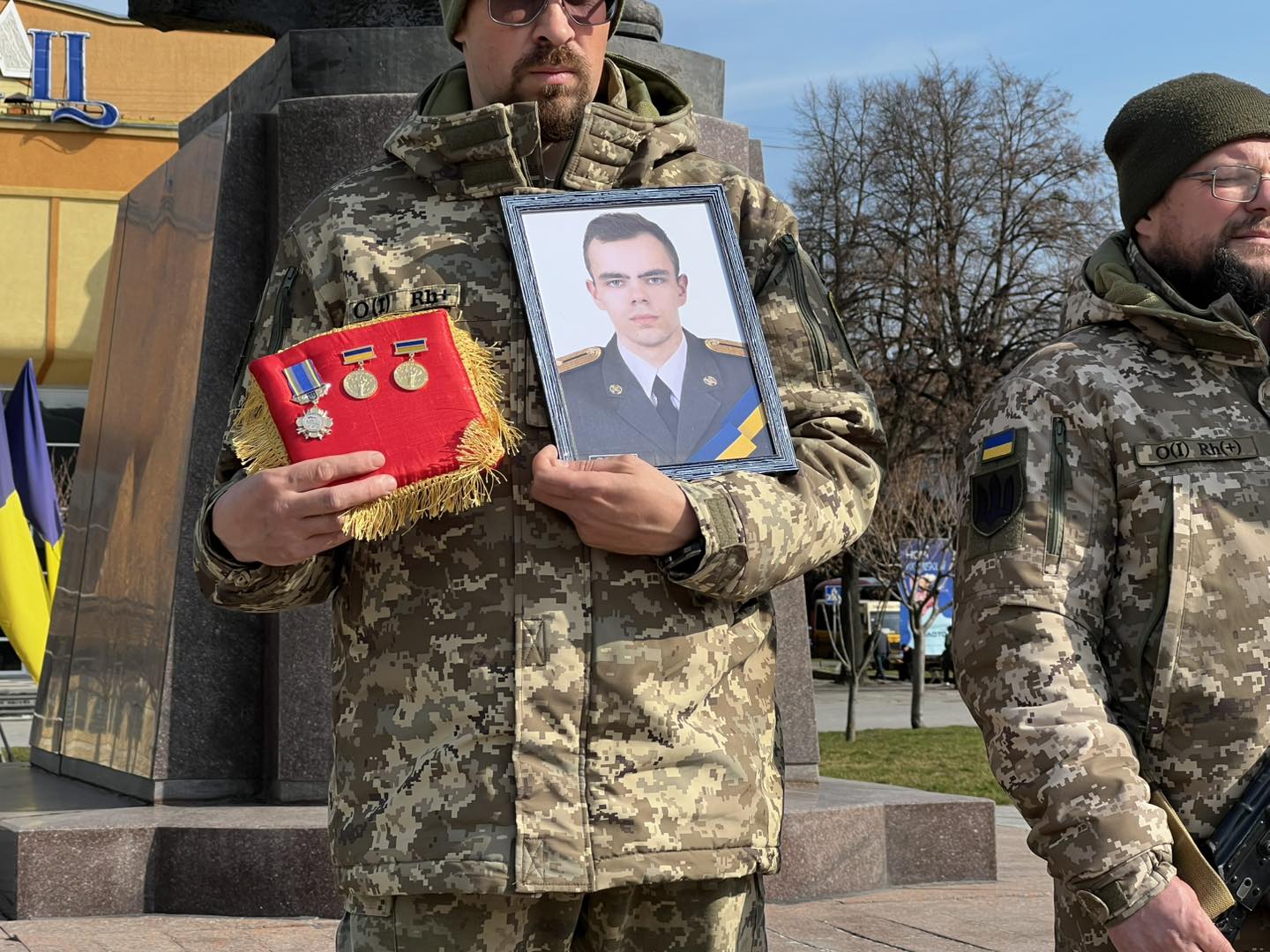 Траурний портрет захисника України Івана Суржука фото: Рівненська міська рада За давнім українським звичаєм, якщо молодий хлопець помирає неодруженим, його проводжають в останню путь як до вінця – з весільним короваєм фото: Рівненська міська рада Прощання із захисником фото: Рівненська міська рада/Facebook