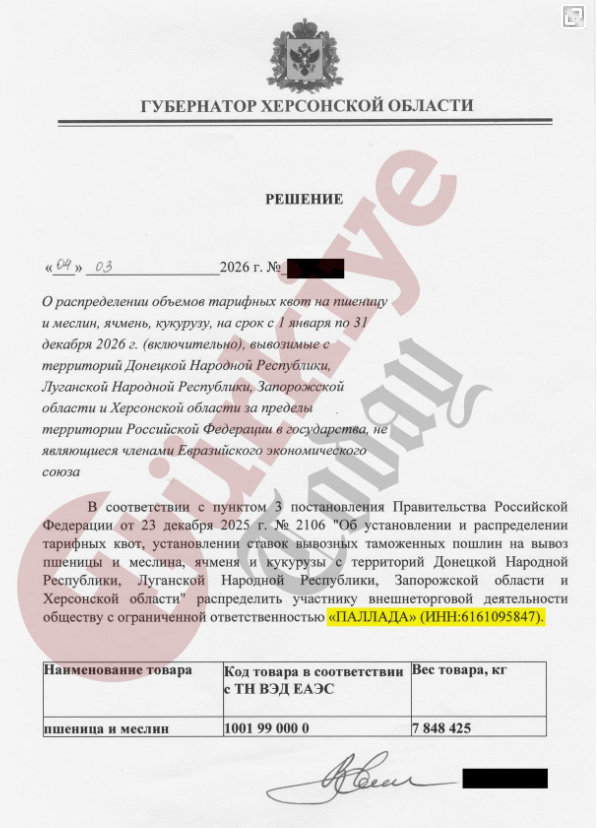 Офіційний документ російською мовою показує дозвіл на експорт для російської приватної фірми ТОВ "Палада" вивозити зерно з окупованих українських територій. російський офіційний документ від 4 березня 2026 року дозволяє компанії експортувати 7 848 тонн зерна з Херсонщини. (Türkiye Today)